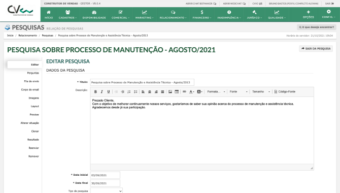 Crie formulários de pesquisas, envie por e-mail para a segmentação escolhida (corretores, clientes e pessoas administrativas), receba as respostas em tempo real e avalie os resultados.