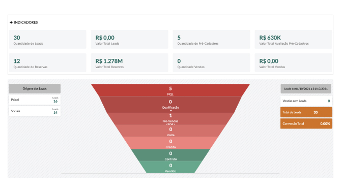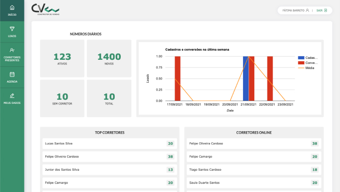Através do Painel de PDV, você consegue cadastrar novos leads e acompanhar o andamento diário de potenciais clientes. Lá, você recebe informações diárias e semanais de novos leads cadastrados, visualiza seus melhores corretores e muito mais.